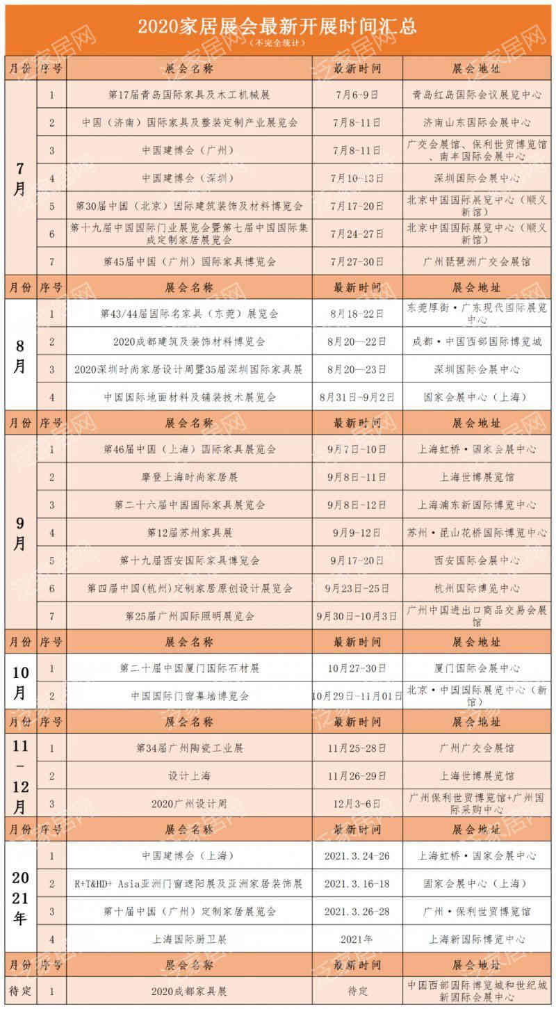 目前,2020成都國際家具展展期待定,而中國建博會(上海)、R+T&HD+ Asia亞洲門窗遮陽展及亞洲家居裝飾展、中國(廣州)定制家居展覽會、上海國際廚衛(wèi)展已明確公布延期至2021年開展。以下是7月至12月已確定展期的部分展會,感興趣的朋友們可以一鍵搜藏。